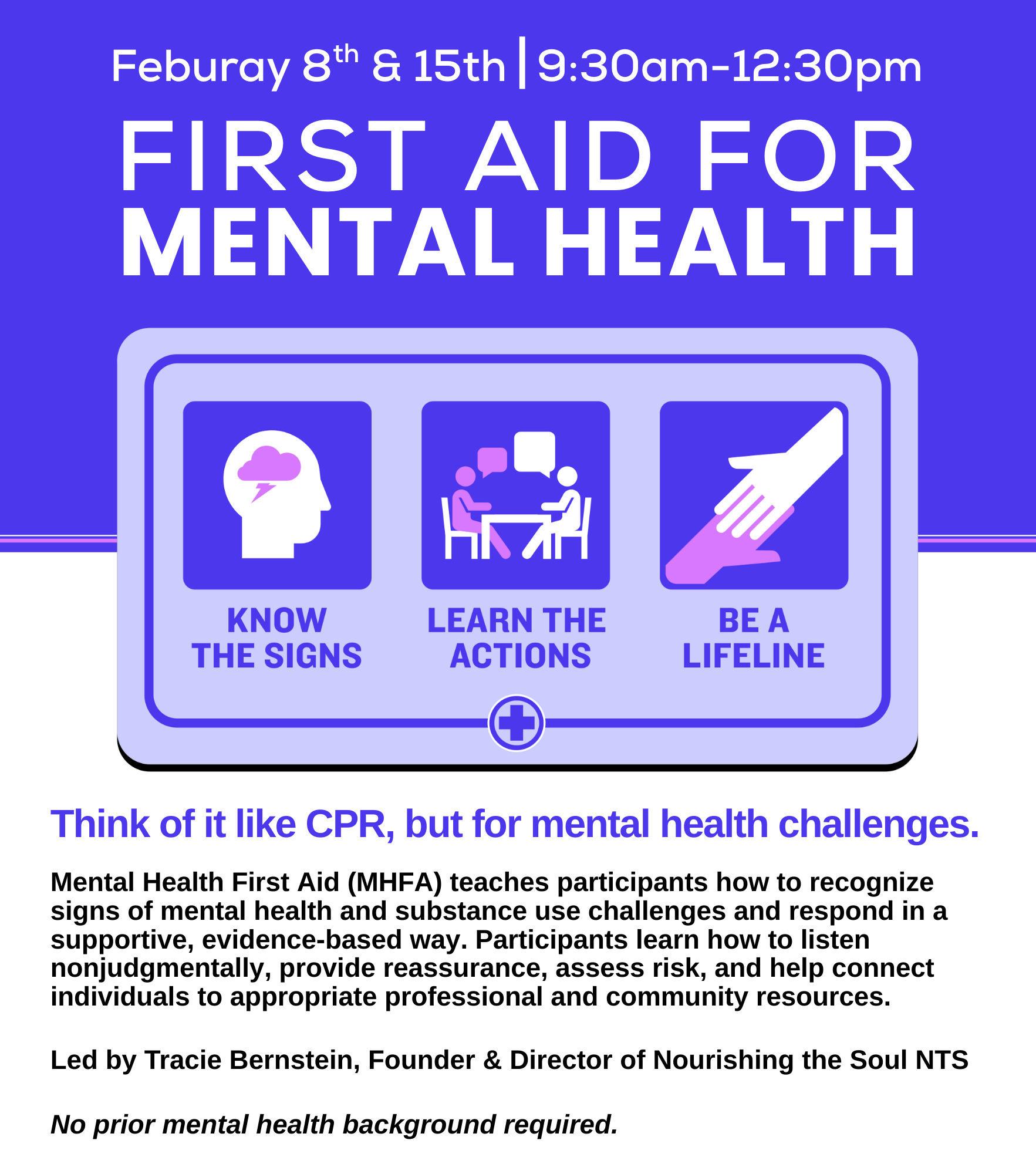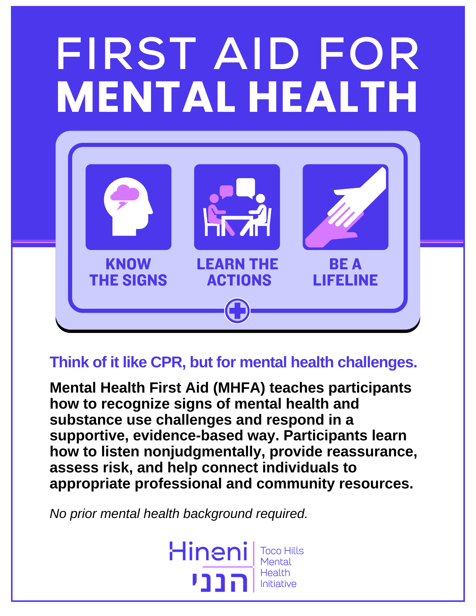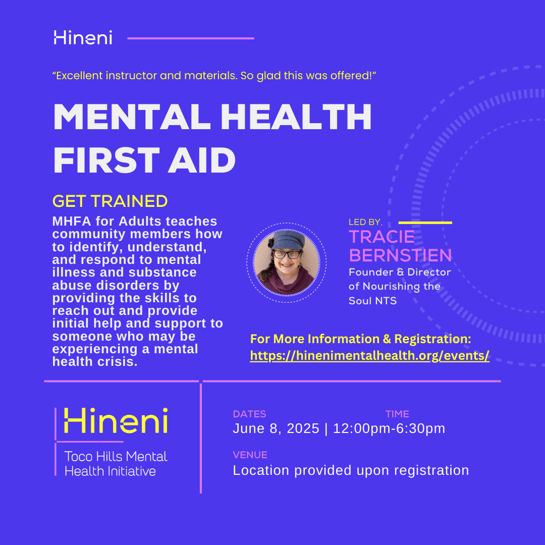The National Council for Mental Wellbeing’s Mental Health First Aid (MHFA), an 8-hour certification course (2 hours of online pre-work plus 6 hours in-person), teaches community members how to identify, understand, and respond to signs of mental illness and substance use disorders. The training, meant for non-mental health professionals, provides the skills one needs to reach out and provide initial help and support someone who may be experiencing a mental health crisis. Tracie Bernstein, Founder and Director of Nourishing the Soul (NTS), partners with Hineni as course facilitator. Tracie is a certified Mental Health First Aider and Trainer. She is also the facilitator for Fayette Factor’s Jewish Community Workshop and Online Toolkit for Mental Health, Substance Abuse, and Recovery.