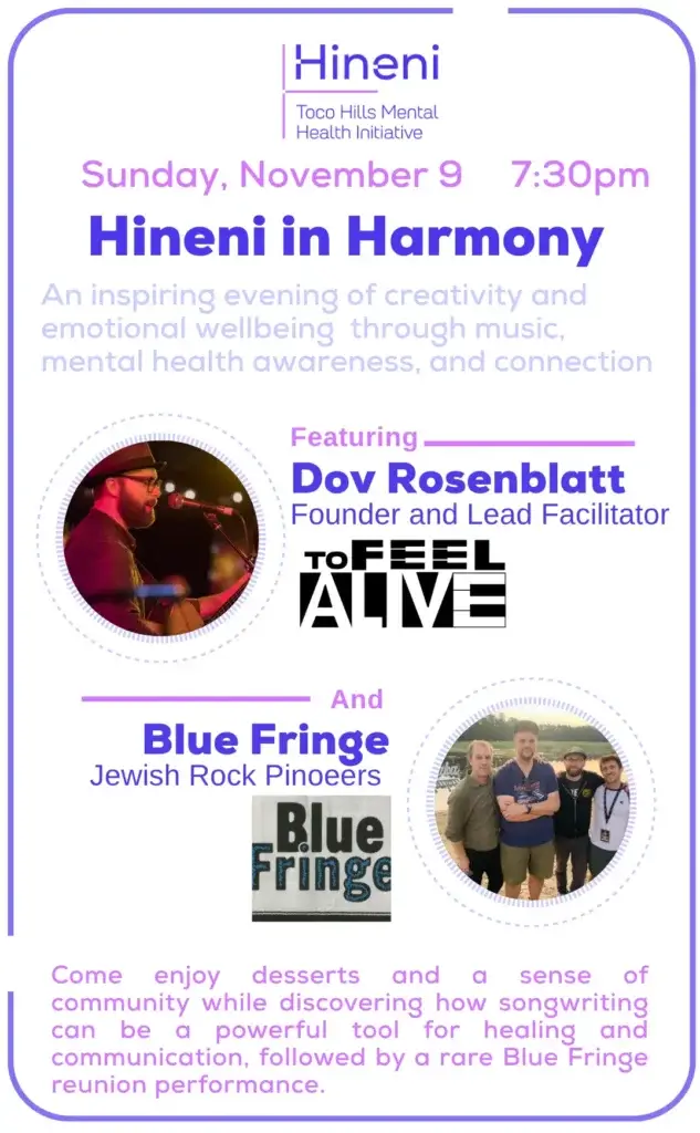 Hineni in Harmony was a sold-out evening of music, mindfulness, and connection, featuring singer-songwriter Dov Rosenblatt. A Baltimore native and lifelong musician, Dov co-founded the pioneering Jewish rock band Blue Fringe and later formed Distant Cousins, with music featured in major films, TV shows, and commercials. He has composed original scores for Netflix’s Impostors and multiple DreamWorks Animation series, served as Cantor-in-Residence at Congregation Sherith Israel in Nashville, and leads To Feel Alive, a program that uses communal songwriting as a tool for expression and connection. After a warm introduction by Atlanta psychiatrist Dr. Eric Fier, Dov shared powerful stories from his therapeutic songwriting work with individuals in intensive mental health treatment and young adults with nonverbal autism. His presentation was described as “extremely informative and eye-opening,” and the energy in the room was palpable—especially during a much-anticipated Blue Fringe reunion that brought joy and nostalgia to longtime fans. Attendees called the evening “inspiring, heartwarming, and soulful,” reflecting the truly transformative spirit of the night.